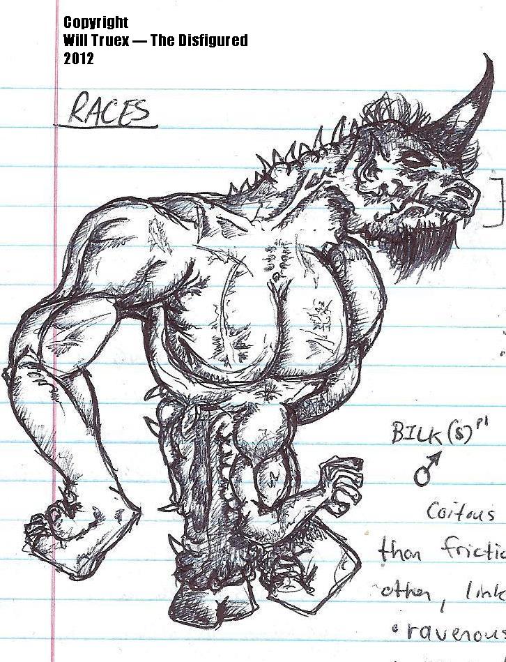 Cool, huh? Looks like a cross between a mutant horse, a bodybuilder, and a rhinoceros. These fuckers are cool- they have. Well. I’m getting ahead of myself, aren’t I? Each time I describe a race in my book, I’ll have a similar layout. I’ll describe their biology, and then go into more about cutlure and interaction. With that said, here’s some more info on the Bilk.